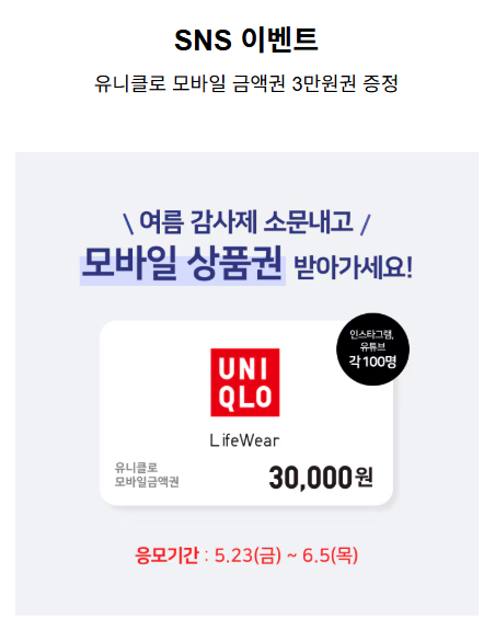 SNS 이벤트도 하고 있어요 유니클로 여름 감사제를 홍보하면 추첨하여 3만원 모바일 상품권을 준다고 합니다.